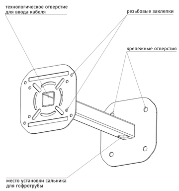 Подходят для установки камер как с использованием монтажных коробок TSi-JB, так и без их использования. Кронштейн имеет четыре крепежные отверстия. Кабель протягивается через технологические отверстия, расположенные в центре монтажной площадки. На лицевой монтажной площадке имеются резьбовые крепления для монтажных коробок.